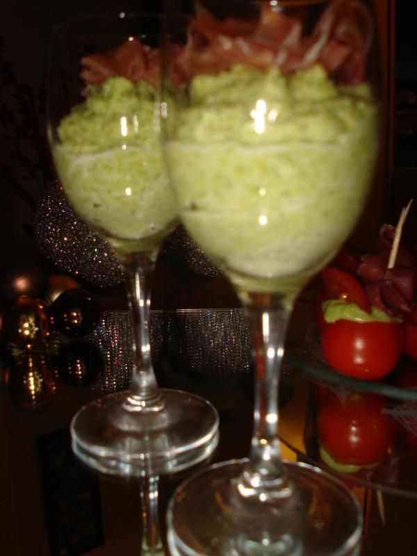 tomates tapas évidées et garnie de mousse d'avocat a l'estragon ,et sur le dessus une tranche de canard fumé chiffonnée sur un pt pic en bois mousse d'avocat a l'estragon;simplement mixer un avocat avec un peu de crème fraiche,sel,poivre,jus de citron et estragon frais Verrine mousse de brocoli,jambon italien