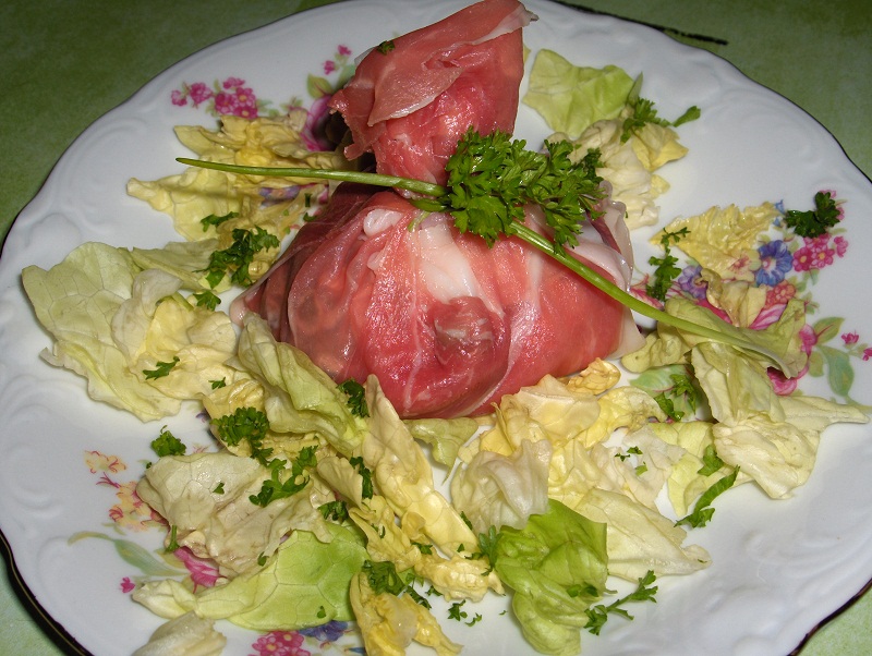 - 2 tranches de jambon cru (ici, jambon de Parme) par personne. - 1 brin de ciboulette pour attacher. - persil, etc. pour garnir. A l'intérieur : macédoine de légumes dés de jambon oeufs durs * Mélanger la macédoine de légumes, avec les dés de jambon et de la mayonnaise. * Mettre 2 tranches de jambon en croix. * Déposer à l"intérieur, le mélange macédoine-jambon et une rondelle d'oeuf.