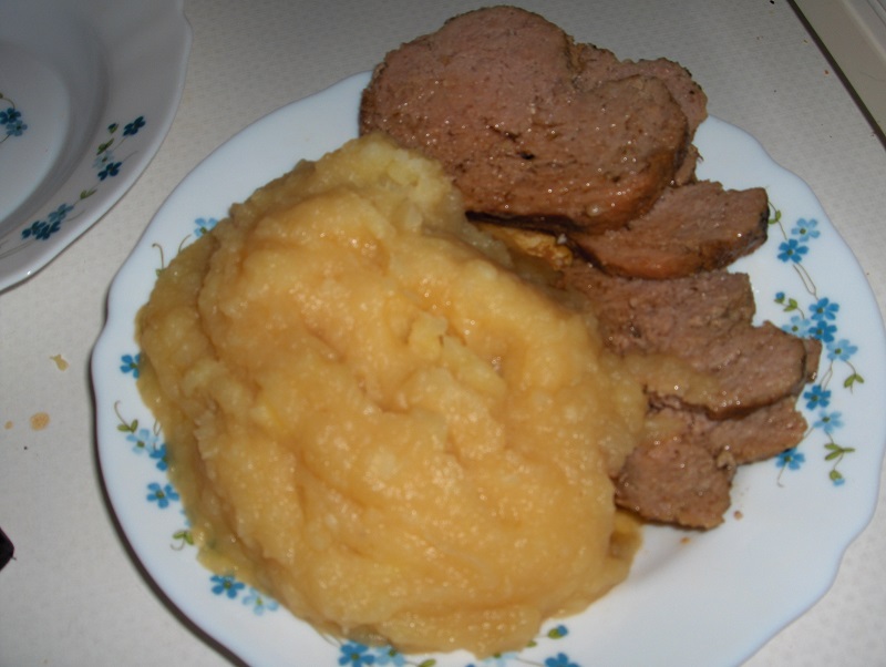 Ce pain de viande peut se manger froid avec une salade ou sur du pain. Ou, chaud, comme sur la photo avec des pommes de terre et de la compote.
