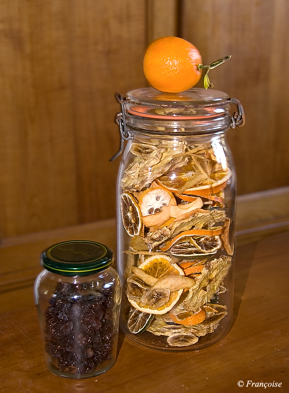 - des pommes - des poires - des citrons verts et jaunes - des oranges - des mandarines - des bananes - de l'ananas - des raisins ( à part dans un autre bocal) J'ai tout mis dans un grand bocal - ça fait très joli - ça sent très bon Que peut-on en faire ? je ferais sans doute des cakes ou des muffins cet hiver On peut faire des pots pourris, car ça sent vraiment très bon On peut les enfiler avec du rafia, pour une déco odorante aussi Pour l'instant ils sont dans le bocal .... c'est aussi agréable à l'oeil ! Donc à plus tard pour mes recettes Dans tous les cas je ne regrette pas cet investissement (raisonnable)