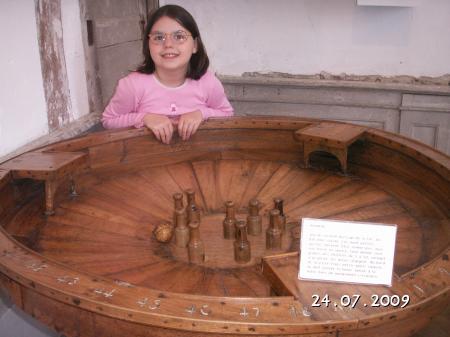 et pas facile de jouer car le rondeau est plaçé sur 1 plan incliné, donc il faut non seulement de la force pour lancer la boule mais aussi de l'adresse et du savoir-faire pour qu'elle passe sous les 3 petits ponts!!!! ce jeu bressan se trouve au musée de Pierre de Bresse dont je vous ai déjà parlé! la règle du jeu