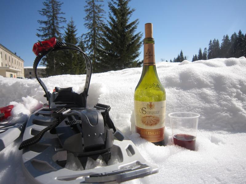 on chausse les raquettes ! et nous voilà partis!! on monte... on descend... on transpire... on souffle fort...pfffffff.... on a soif... on boit une bonne rasade "d'eau" !!!!! on traverse la forêt et là ouïllllllllle la neige est verglacée... faut bien placer nos crampons... ahhhh vivement le plancher des vaches!!!!! on était bien tous les 2 !!!