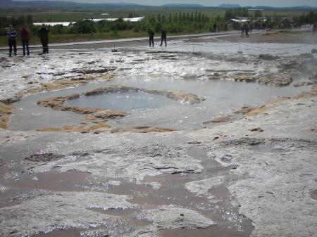 On peut aisément fabriquer des geysers en laboratoire. C’est un phénomène bien connu. Un moyen d’activer un geyser est de mettre du savon pour lubrifier la colonne. Il n’y a plus d’éruptions volcaniques sur ce site mais il y a encore de la chaleur emmagasinée dans le sol qui chauffe des nappes phréatiques, des nappes d’eau de pluie. C’est un phénomène géothermique parmi d’autres que nous verrons : les fumeroles, les marmites de boue bleue, des solfatares, des sources chaudes... Il y en aura de vraiment magnifiques sur notre parcours. Je sais, vous voudriez bien que j’aille plus vite dans mon récit...mais patience, ça vaut le déplacement. Les phénomènes géothermiques sont très liés aux tremblements de terre fréquents sur l’île et annonciateurs d’éruptions volcaniques. Par exemple le grand geyser a recommencé à faire quelques jaillissements en 2000 après un tremblement de terre, puis s’est de nouveau éteint. |