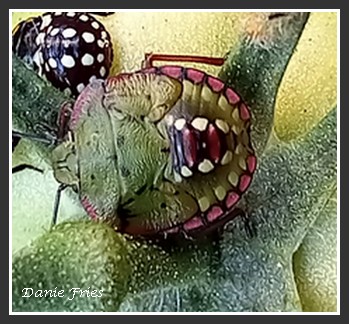 Je me demandais ce que c'était que ces petits insectes joliment décorés ! qui se baladaient sur mes tomates, jusqu'à ce que j'ai vu la bébête adulte un peu plus loin ! ![]() Oh punaise !