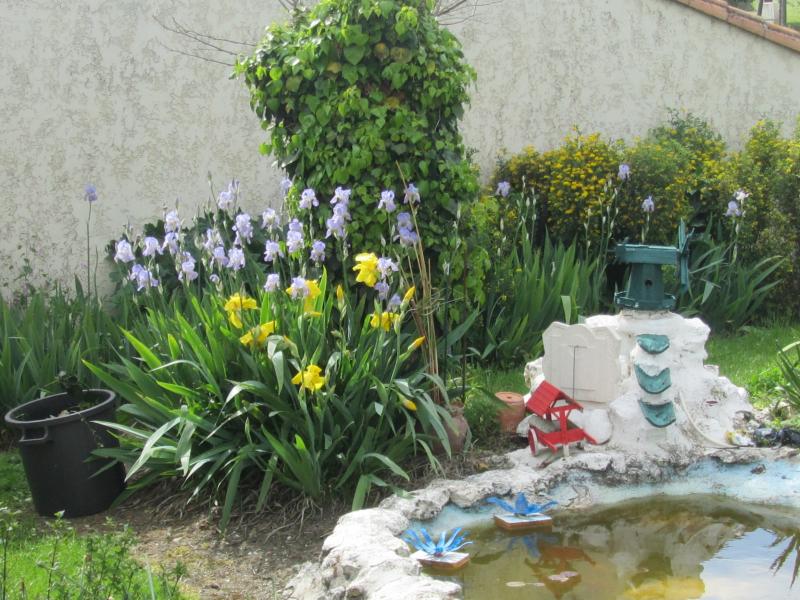 Voila une image de mon petit basin de mon jardin avec des poissons et une fontaine . le problème c'est que l'eau n'est pas claire , J'ai beau acheter du produis rien n'a faire !