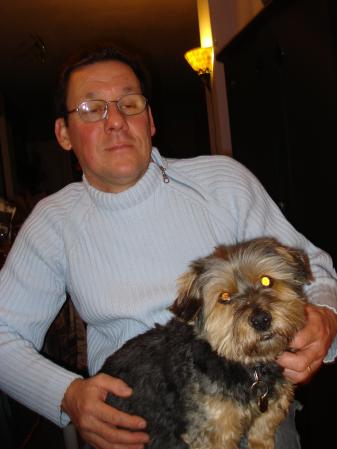 tiens mon maitre est cool en pyjama.... lorsque mes maitres ont une visite je me cache ,un peu peureuse mais sur cette photo je ne suis la que depuis 2j