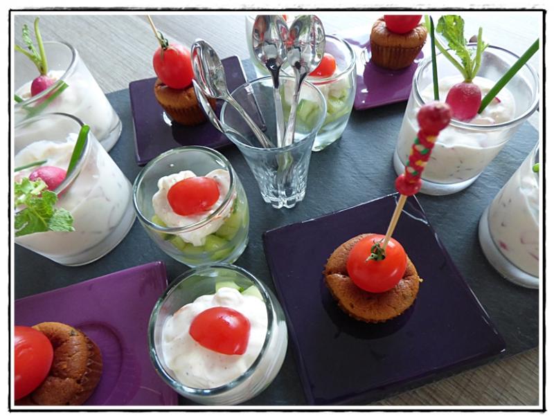 - Tomates farcies au thon - Cakes aux fanes de radis - Tartinade de radis noir - Cake au bacon fumé - Salade de céleri-rave aux raisins secs et aux noix - Verrines de betteraves rouges aux noix - Tartinade de chorizo - Verrines de guacamole au surimi - Tartinade de radis roses - Petits flans aux fanes de radis - Soupe froide de concombre - Muffins façon pizza - Roulades d'asperges au jambon cru sauce au miel - Soufflés aux cèpes - Foie gras - Pâté de campagne aux noisettes - Céleri rémoulade - Muffins à la courgette - Saucisson brioché - Moelleux à la courgette LES GLACES ET LES SORBETS.....