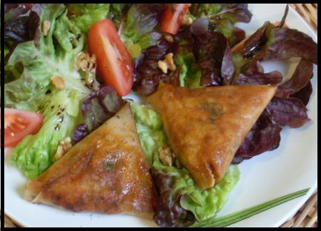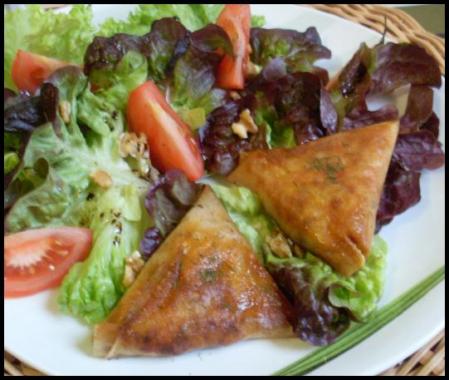 - 1 salade verte - 4 tomates bien mûres - 150 g de dés de jambon - Mozarella ou autre fromage frais - 8 à 10 tranches de Camembert (ou chèvre frais) - 8 à 10 rondelles de pains - Quelques branches de persil - Huile de noix - Vinaigre de vin - Sel - Poivre du moulin Nettoyez, lavez et égoutez la salade verte. Sur chaque assiette, disposez la salade que vous aurez vinaigré avec l'huile de noix et le vinaigre de vin. Déposez autour des rondelles épaisses de tomates, les dés de jambon et le fromage frais coupé en petits morceaux. Parsemez de persil ciselé. Déposez les rondelles de camembert sur les petits morceaux de pain. faites griller le tout de telle façon que le fromage fonde légèrement. Placez-les au centre de chaque assiette. Servez frais.