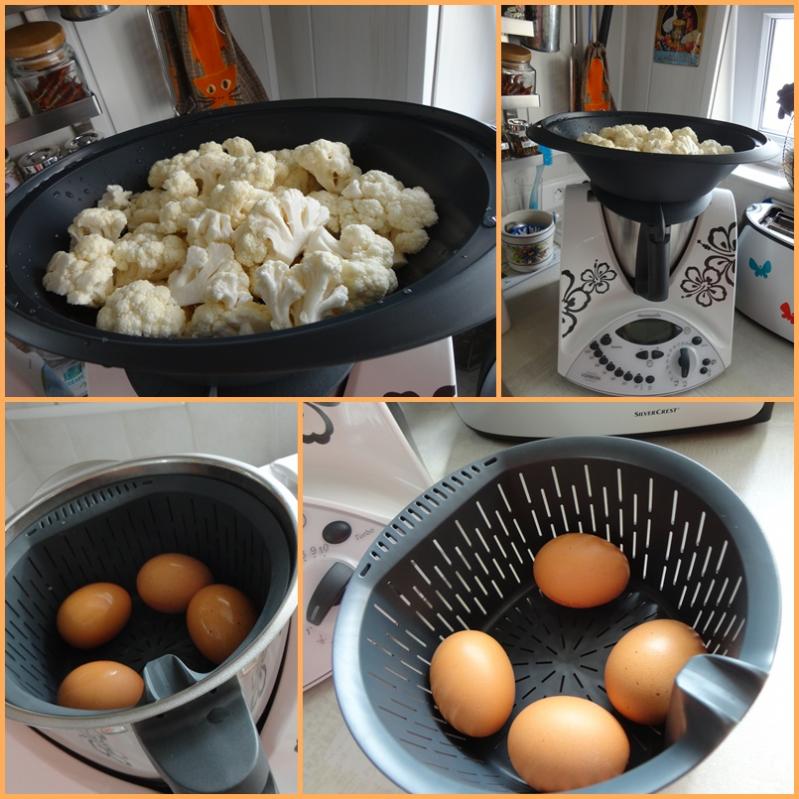 4 - A l'arrêt de la minuterie, réserver le Varoma avec le chou-fleur cuit et le panier de cuisson avec les oeufs.