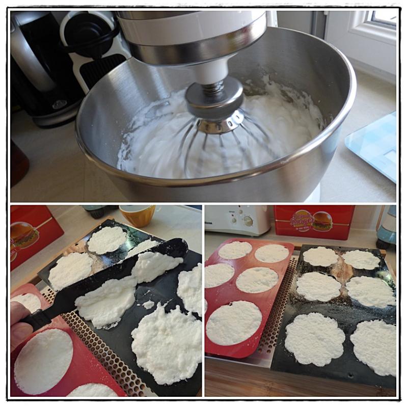 1 - Mettre 14g de sucre dans le bol et mixer 10 econdes, vitesse 10 pour obtenir du sucre glace. 2 - Insérer le fouet, ajouter les 4 blancs d'oeufs et la pincée de sel. Chauffer 6 minutes, 70°, vitesse 3,5 sans le gobelet, en augmentant progressivement la vitesse pendant la première minute. 3 - Poser une feuille de papier essuie-tout sur le plateau vapeur. Diviser la quantité de blancs en neige en portions et les déposer sur le plateau vapeur pour leur permettre de s'égoutter. 4 - Placer le plateau vapeur dans le réfrigérateur.