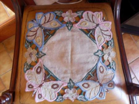 Ma semaine a été assez dure. Maman est tombée dans son jardin. Elle à juste une plaie à la jambe heureusement ) Elle habite en ville mais à un peit jardin séparé par des bordures en ciment faites par mon père il y a bien longtemps. (je lui avais pourtant défendu de monter dans le jardin ) Comme elle n' a plus trop le sens de l'équilibre elle est tombée (elle aurait pu se cogner la tête) C'est son aide ménagère qui m'a prévenue Donc médecin, infirmière, pansements pendant vingts jours. Je l'ai également emmené chez un dermatologue. Elle à un petit bouton sous l'oeil. J'ai aussi aidé mon fils.En faisant "le livreur d'un magasin à l'autre) Suite à le tempête il rachète du matériel d'occasion ou fait refaire des moteurs électriques (en attendant une hypothétique aide gouvernementale) En ce moment les huitres ne se vendent pas (suite à la découverte d'une bactérie) Heureusement pour lui la saison est terminée car il ne vend que sur Paris pendant 6 mois. Mais pour la plupart des autres ostréïculteurs c'est encore un coup dure Donc je n'ai pas fait beaucoup de cuisine Je vous mets un petit napperon que maman m'a donné pour le nettoyer. je le trouve très joli. Elle l'a fait il y a bien longtemps Je vais maintenant regarder vos blogs Bisous |